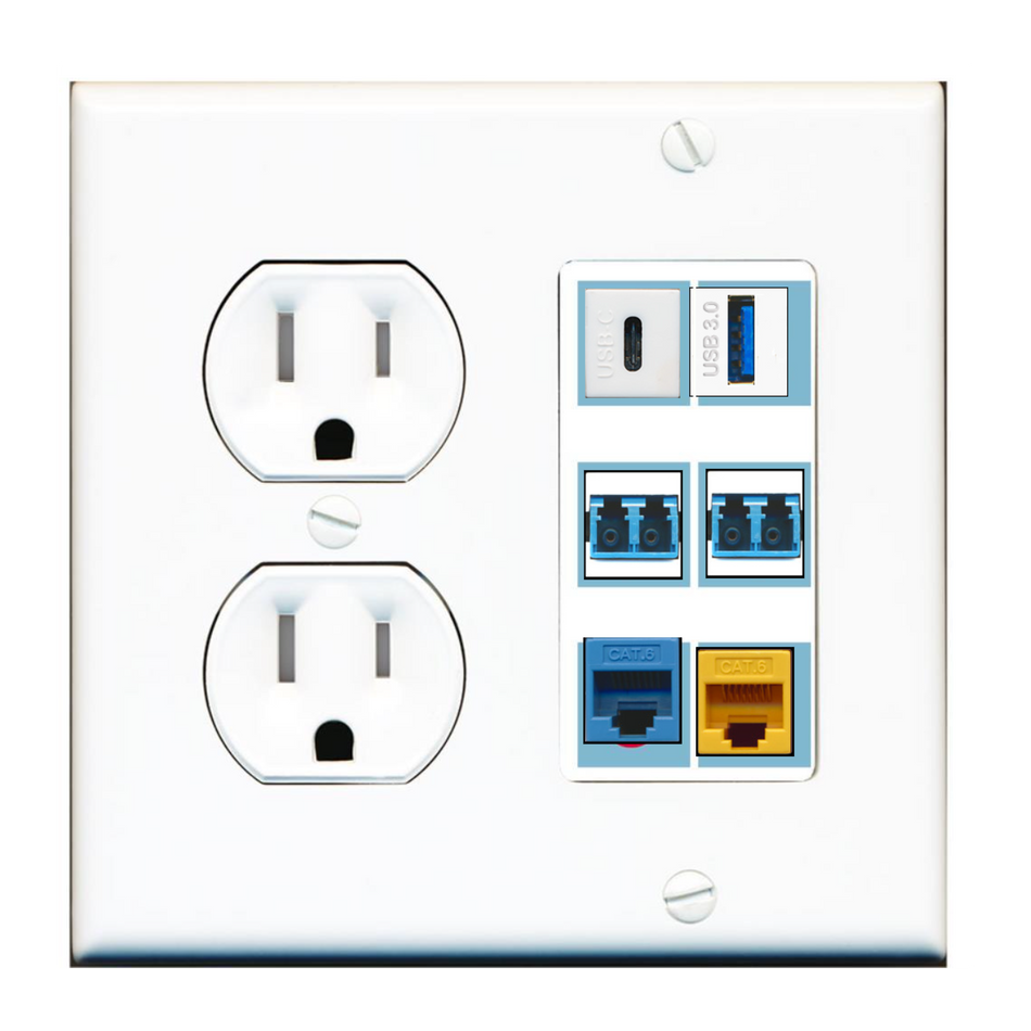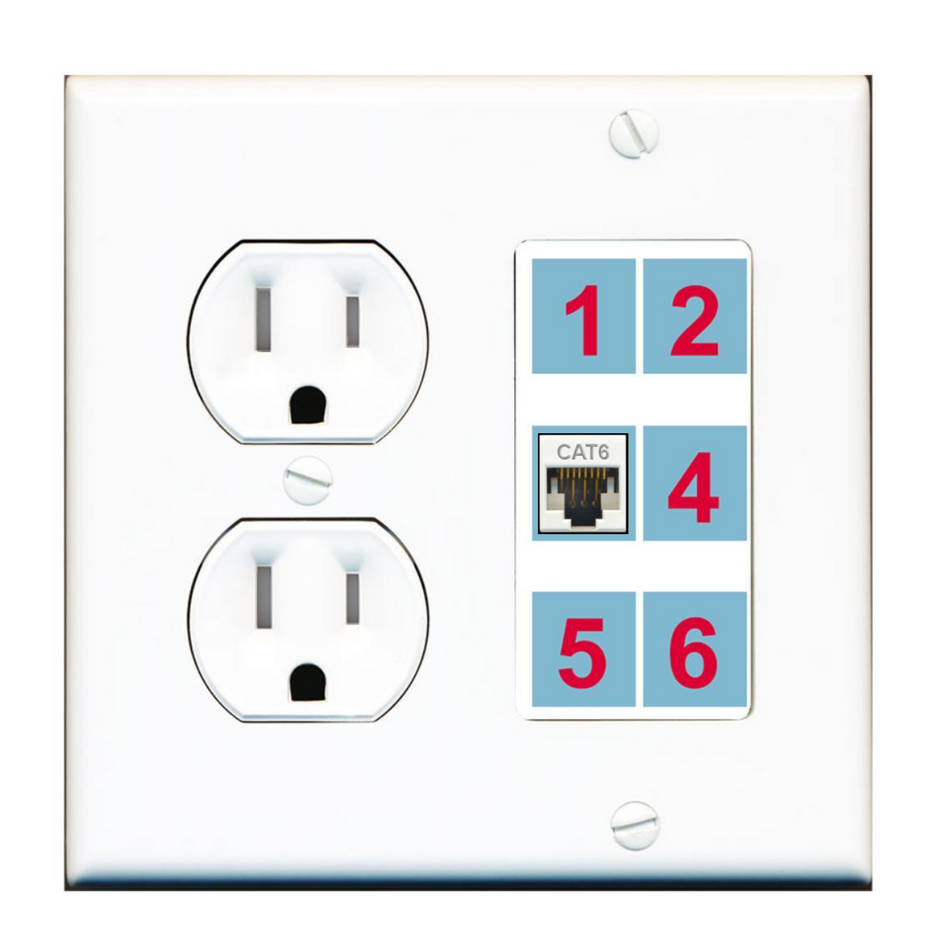6 Port Custom Keystone Wall Plate with Tamper Resistant DecorZ Power Outlet