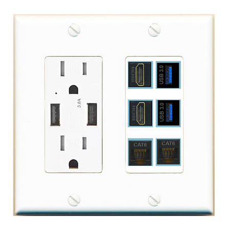 SKU: custom-wall-plate-2-x-usb-charger-15-amp-power-outlet-white-with-up-to-6-keystone-ports-choose-your-own-ports