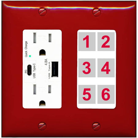RiteAV 6 Port Custom Wall Plate - USB A+C Charger [Red/White]
