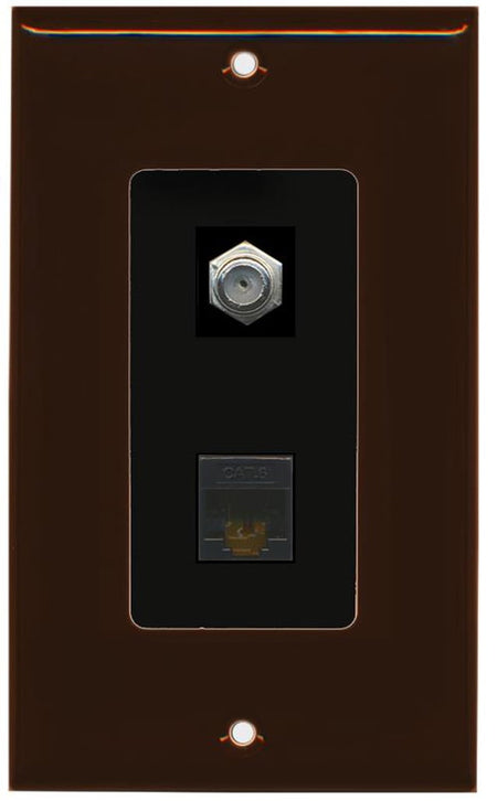 RiteAV - 1 Coax Cable TV F and 1 Cat6 Ethernet Wall Plate Decorative - Brown & Black - Bracket Included