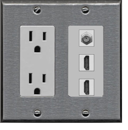 RiteAV - 15 Amp Power Outlet 2 Port HDMI 1 Port Coax Decorative Wall Plate - Stainless Steel & Gray
