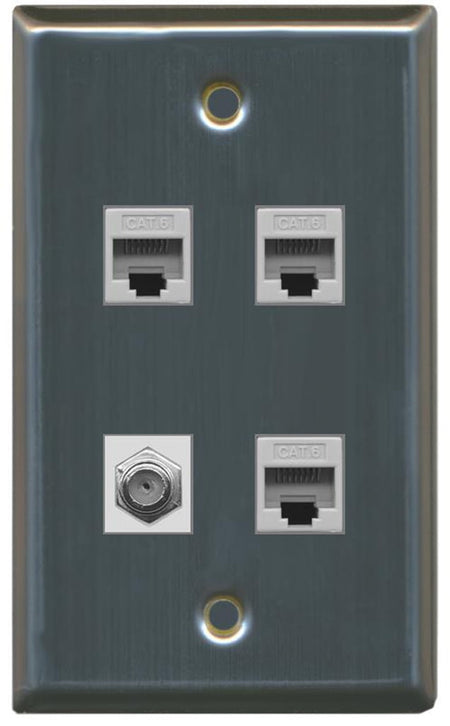RiteAV 1 Port Coax Cable TV- F-Type 3 Port Cat6 Ethernet Wall Plate - Stainless Steel