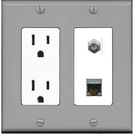 RiteAV - 15 Amp Power Outlet 1 Port Coax Cable TV- F-Type and Shielded Cat6 Ethernet Wall Plate - Gray/White