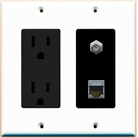 RiteAV - 15 Amp Power Outlet 1 Port Coax Cable TV- F-Type and Shielded Cat6 Ethernet Wall Plate - White/Black