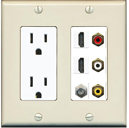 RiteAV - 2 x 15 Amp 125V Power Outlet 3 x RCA - 2 X HDMI and 1 x Coax Cable TV Port Wall Plate - Light Almond/White