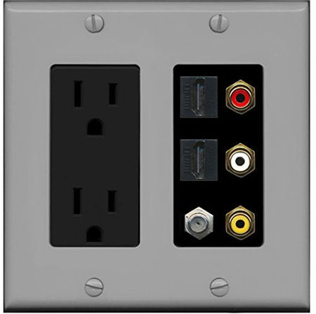 RiteAV - 2 x 15 Amp 125V Power Outlet 3 x RCA - 2 X HDMI and 1 x Coax Cable TV Port Wall Plate - Gray/Black