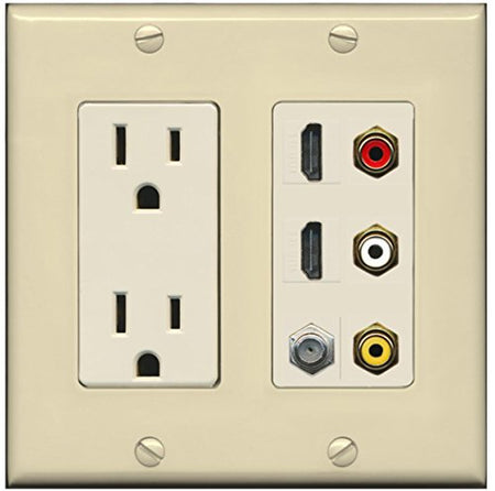RiteAV - 2 x 15 Amp 125V Power Outlet 3 x RCA - 2 X HDMI and 1 x Coax Cable TV Port Wall Plate - Ivory/Light Almond
