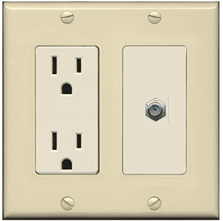RiteAV - 15 Amp Power Outlet and 1 Port Coax Cable TV- F-Type Decorative Type Wall Plate - Ivory/Light Almond is constructed from high-quality materials that will provide a hassle-free service life after a quick and simple installation. The ready-to-install plate includes a self-grounding receptacle, which has the option of both push-in or terminal screw wiring options, a stylish surround (or cover plate) and keystone couplers which are color-matched to the other components for a perfect look. This discreet solution enables you to route your cabling through the walls and results in a clean, professional look behind wall mounted televisions, monitors, projectors and entertainment centers in both residential (home theater) and commercial (classroom, boardroom, factory floor, recording studio, etc.) settings. We include the sturdy hardware to mount both pieces securely and the added benefit is that the heads of the mounting screws are painted the respective color of the other components for a seamless appearance. The plates are suitable for both residential and commercial use and with the coordinating color options, they blend better with walls, backsplashes, trim or room decor. They're perfect for contractors, builders, interior designers or the DIYers that are remodeling a home and want their outlets to match or complement paint/finishes. RiteAV offers a wide variety of A/V Plates to suit any connection requirement, so be sure to check out our entire catalog of products. Please note that we recommend that a certified electrician perform the installation for any line-voltage related work and that all National Electrical Codes are followed during installation.
