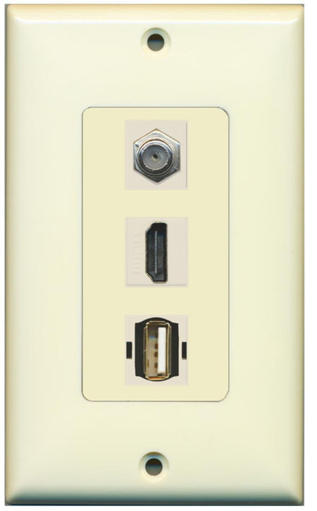 RiteAV - 1 Port HDMI and 1 Port Coax Cable TV- F-Type and 1 Port USB A-A Decorative Wall Plate - Light Almond