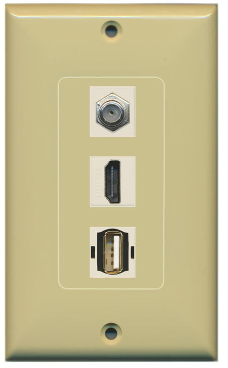RiteAV - 1 Port HDMI and 1 Port Coax Cable TV- F-Type and 1 Port USB A-A Decorative Wall Plate - Ivory