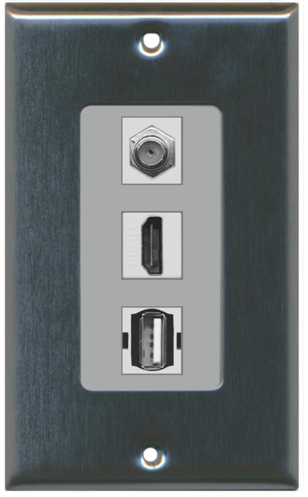RiteAV - 1 Port HDMI and 1 Port Coax Cable TV- F-Type and 1 Port USB A-A Decorative Wall Plate - Stainless Steel/Gray