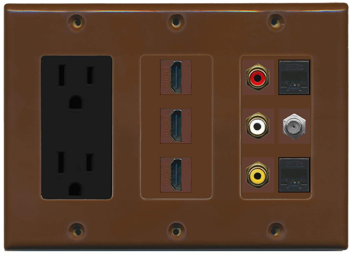 RiteAV Power 3 Port HDMI Composite 3-RCA A/V 2 Cat5e Ethernet Coax TV Wall Plate - Brown
