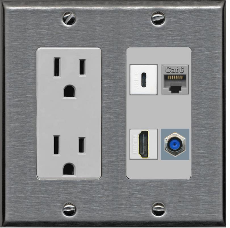RiteAV USBC HDMI Cat6 Coax F81 Wall Plate - Outlet [Stainless/Gray]