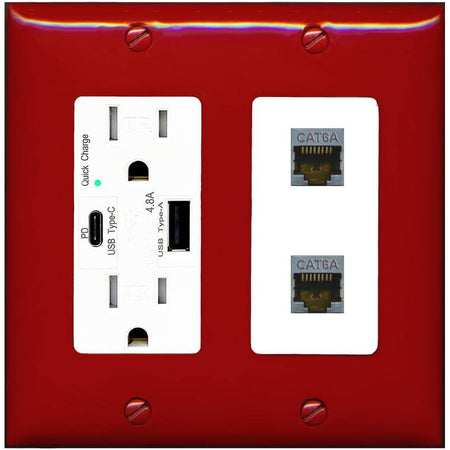 RiteAV 2 Port Cat6A Wall Plate - USB A+C Charger [Red/White]
