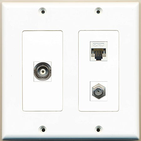 RiteAV - 1 Port Coax Cable TV- F-Type 1 Port BNC 1 Port Cat5e Ethernet White - 2 Gang Wall Plate