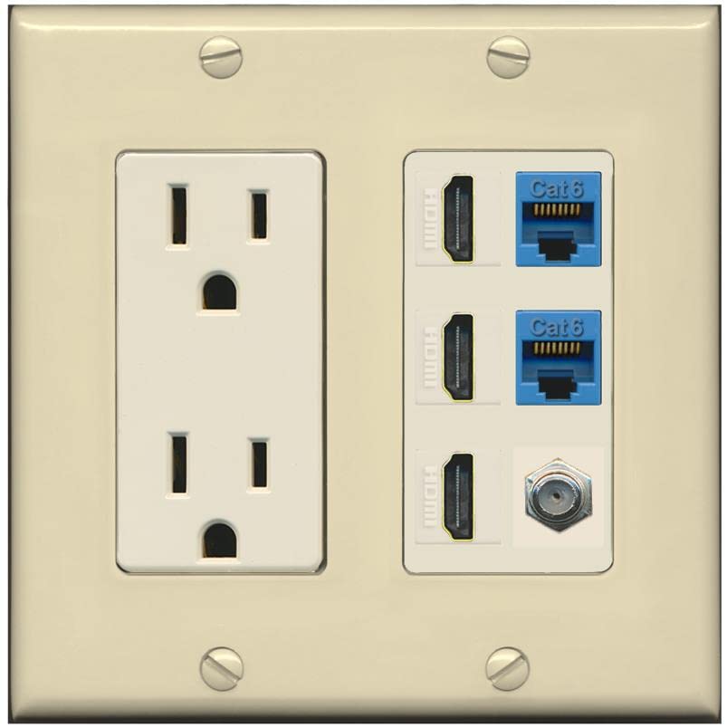 RiteAV 3 HDMI Wall Plate 2 Cat6 1 Coax - Outlet [Ivory/Light-Almond]