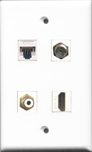 RiteAV - 1 Port HDMI and 1 Port RCA White and 1 Port Coax Cable TV- F-Type and 1 Port Cat5e Ethernet White Wall Plate
