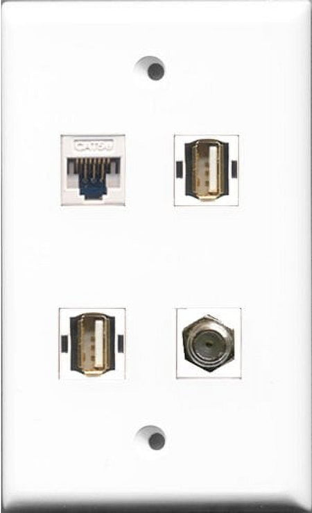 RiteAV 1 Port Coax Cable TV- F-Type 2 Port USB A-A and 1 Port Cat5e Ethernet White Wall Plate