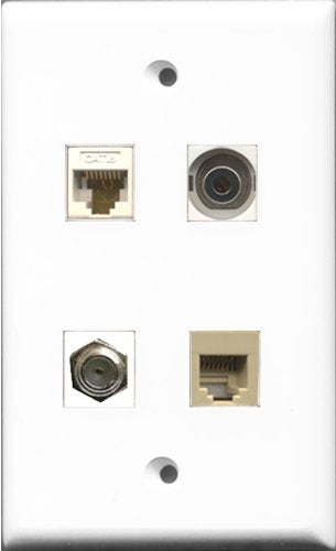 RiteAV - and 1 Port Coax Cable TV- F-Type and 1 Port Phone RJ11 RJ12 Beige and 1 Port 3.5mm and 1 Port Cat6 Ethernet White Wall Plate