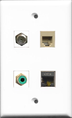 RiteAV 1 Port RCA Green and 1 Port Coax Cable TV- F-Type and 1 Port Phone RJ11 RJ12 Beige and 1 Port Shielded Cat6 Ethernet Wall Plate