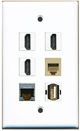 RiteAV - 3 HDMI 1 Port USB A-A 1 Port Phone RJ11 RJ12 Beige 1 Port Shielded Cat6 Ethernet Wall Plate