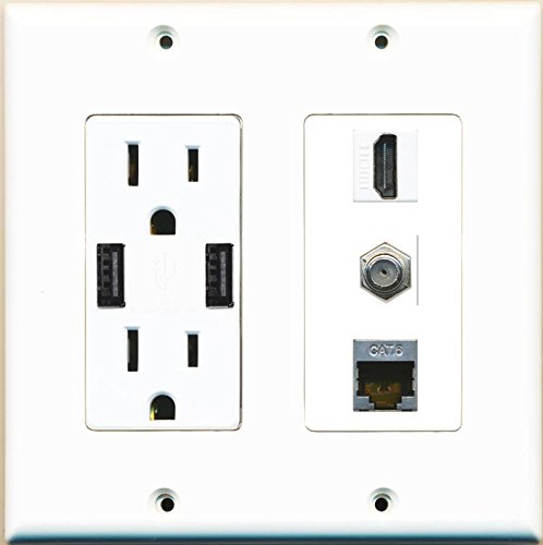 RiteAV Power Outlet 2 USB Charger HDMI Coax Shielded Cat6 Wall Plate White