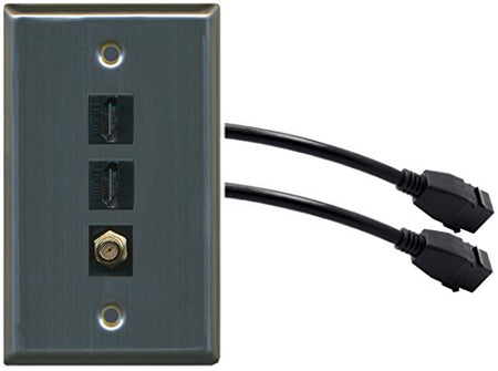 RiteAV (1 Gang Flat) 2 HDMI Black Coax Wall Plate w/Pigtail Extension Cable Stainless Steel