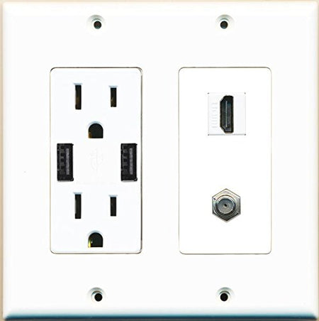 RiteAV 15 Amp 125V Power Outlet (2 Powered USB Charger Receptacle) Hdmi Coax Wall Plate 2 Gang White