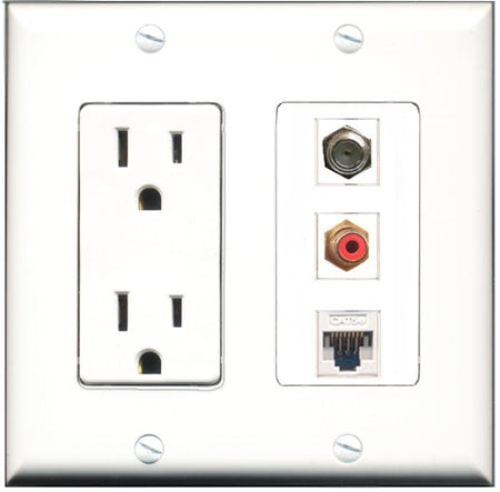 RiteAV - 15 Amp Power Outlet 1 Port RCA Red 1 Port Coax 1 Port Cat5e Ethernet White Decorative Wall Plate