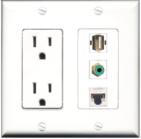 RiteAV - 15 Amp Power Outlet 1 Port RCA Green 1 Port USB A-A 1 Port Cat5e Ethernet White Decorative Wall Plate