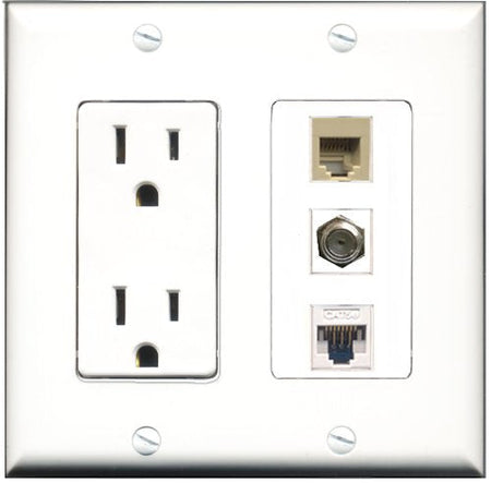 RiteAV - 15 Amp Power Outlet 1 Port Coax 1 Port Phone Beige 1 Port Cat5e Ethernet White Decorative Wall Plate