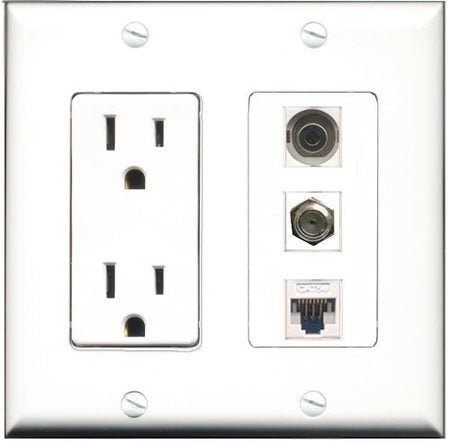 RiteAV - 15 Amp Power Outlet 1 Port Coax 1 Port 3.5mm 1 Port Cat5e Ethernet White Decorative Wall Plate