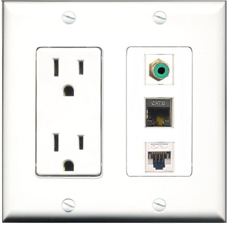 RiteAV - 15 Amp Power Outlet 1 Port RCA Green 1 Port Shielded Cat6 Ethernet Ethernet 1 Port Cat5e Ethernet White Decorative Wall Plate
