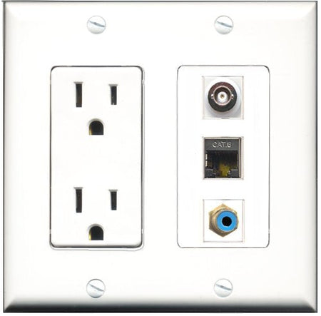 RiteAV - 15 Amp Power Outlet 1 Port RCA Blue 1 Port Shielded Cat6 Ethernet Ethernet 1 Port BNC Decorative Wall Plate