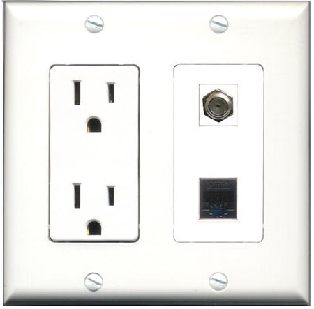 RiteAV - 15 Amp Power Outlet and 1 Port Coax Cable TV- F-Type and 1 Port Cat5e Ethernet Black Decorative Type Wall Plate White