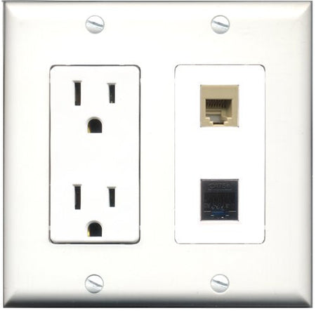RiteAV - 15 Amp Power Outlet and 1 Port Phone RJ11 RJ12 Beige and 1 Port Cat5e Ethernet Black Decorative Type Wall Plate White