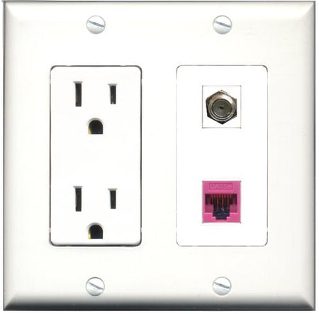 RiteAV - 15 Amp Power Outlet and 1 Port Coax Cable TV- F-Type and 1 Port Cat5e Ethernet Pink Decorative Type Wall Plate White