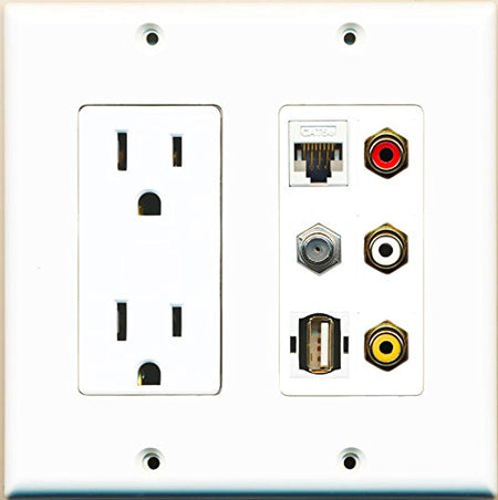 RiteAV Power Outlet and Cat5E Ethernet 3 RCA Composite Coax USB Wall Plate White. Tooless connection Just plug one cable into the front and one into the back of each port. Wall plate looks the same on the front and back (female to female). Fits standard outlet boxes and low voltage mounting brackets. Jacks in RiteAV plates are removeable for future upgrades. High quality item. Screws included.
