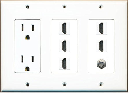 RiteAV - (3 Gang 15A Power Outlet 5 HDMI Coax Cable TV Wall Plate White