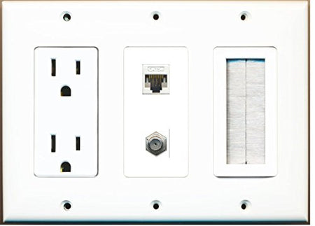 RiteAV - (3 Gang 15A Power Outlet Mesh-Brush Coax Cat5e White Wall Plate White