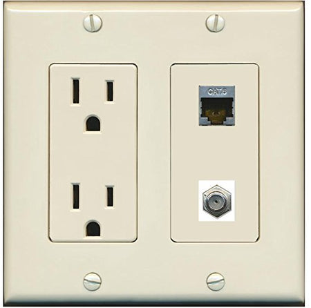 RiteAV - (2 Gang Decorative 15A Power Outlet Coax Shielded Cat6 Wall Plate Light Almond