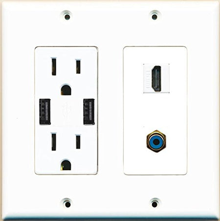 RiteAV 15 Amp 125V Power Outlet (2 Powered USB Charger Receptacle) Hdmi RCA Blue Wall Plate White