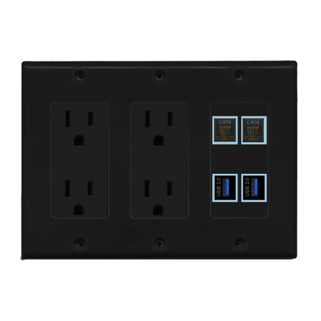 4 Port Custom Keystone Wall Plate w/Dual DecorZ Power Outlet Black