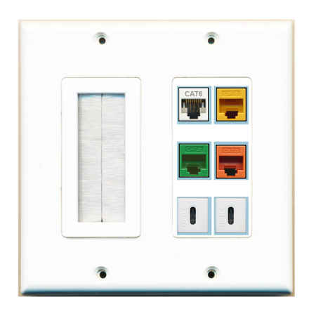 Simple female to female plug in connection. This item comes in a thermoplastic finish and screws are included. It's a simple and effective way to organize your cables. Wall plate fits standard U.S. outlet boxes and drywall brackets.