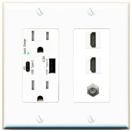 COAX 2 HDMI Wall Plate-USB A+C Charger White